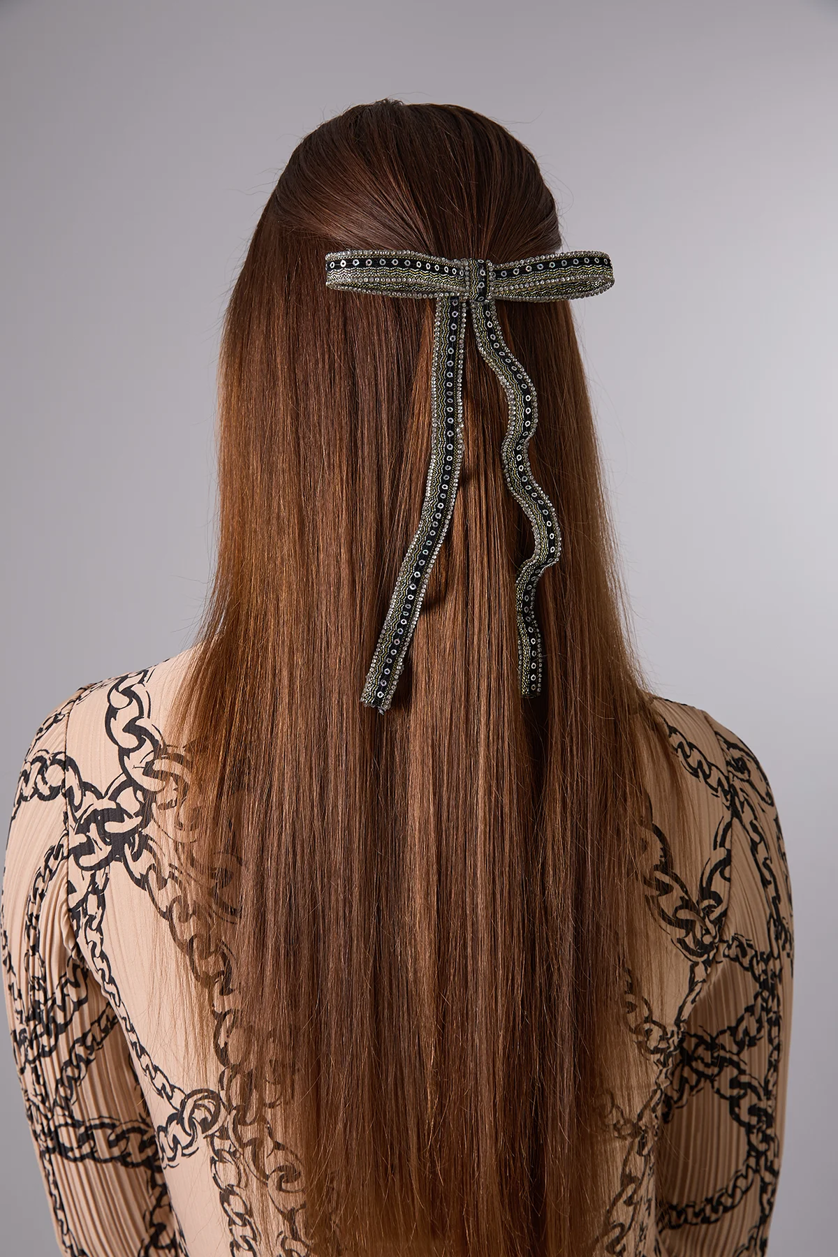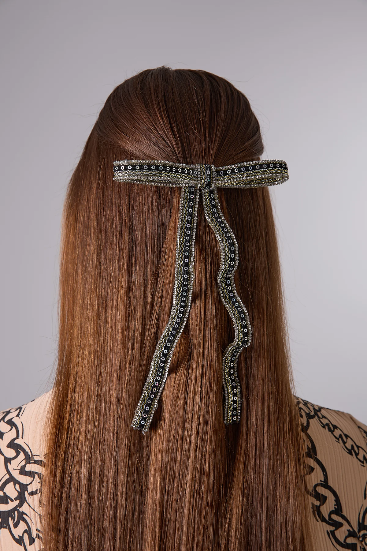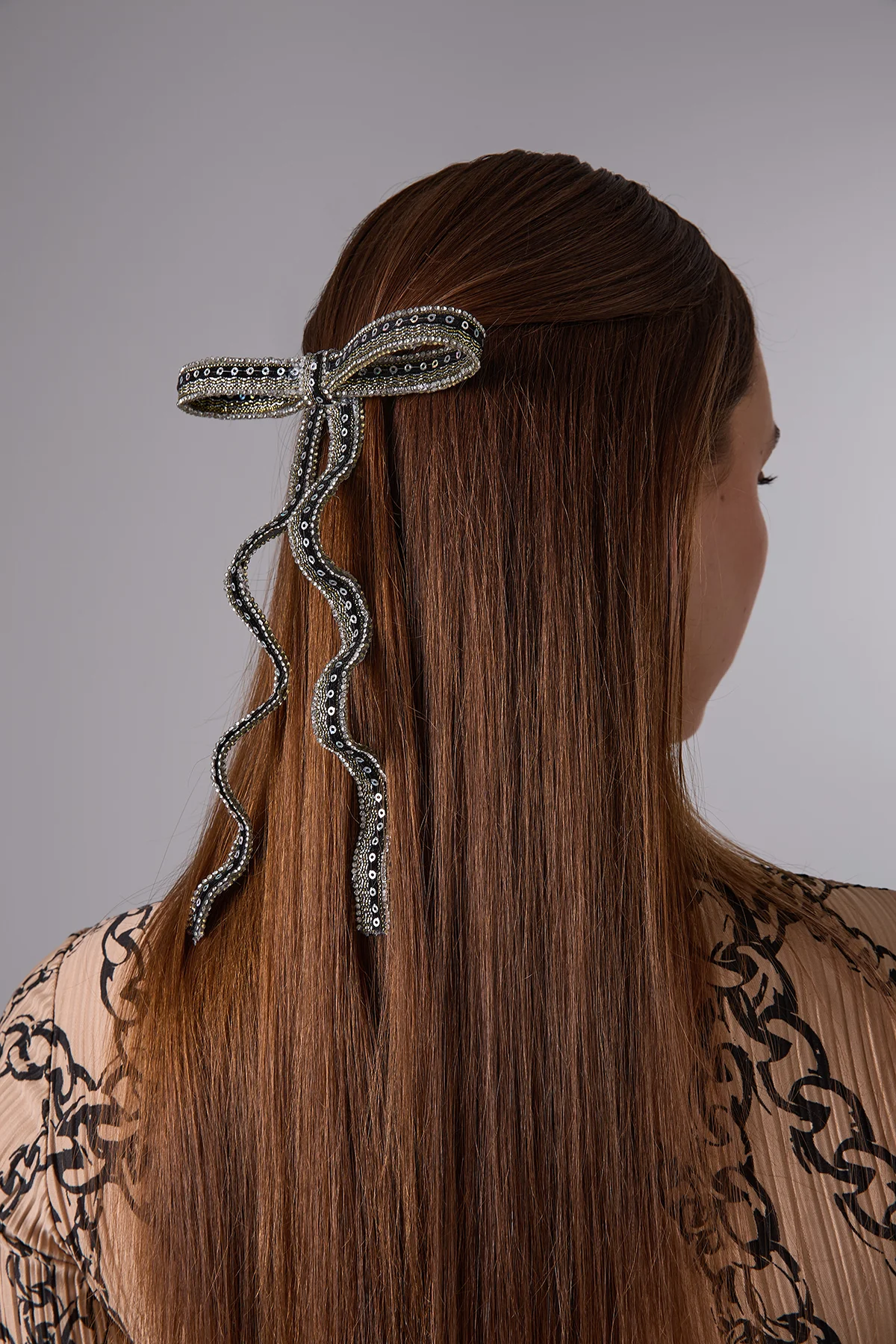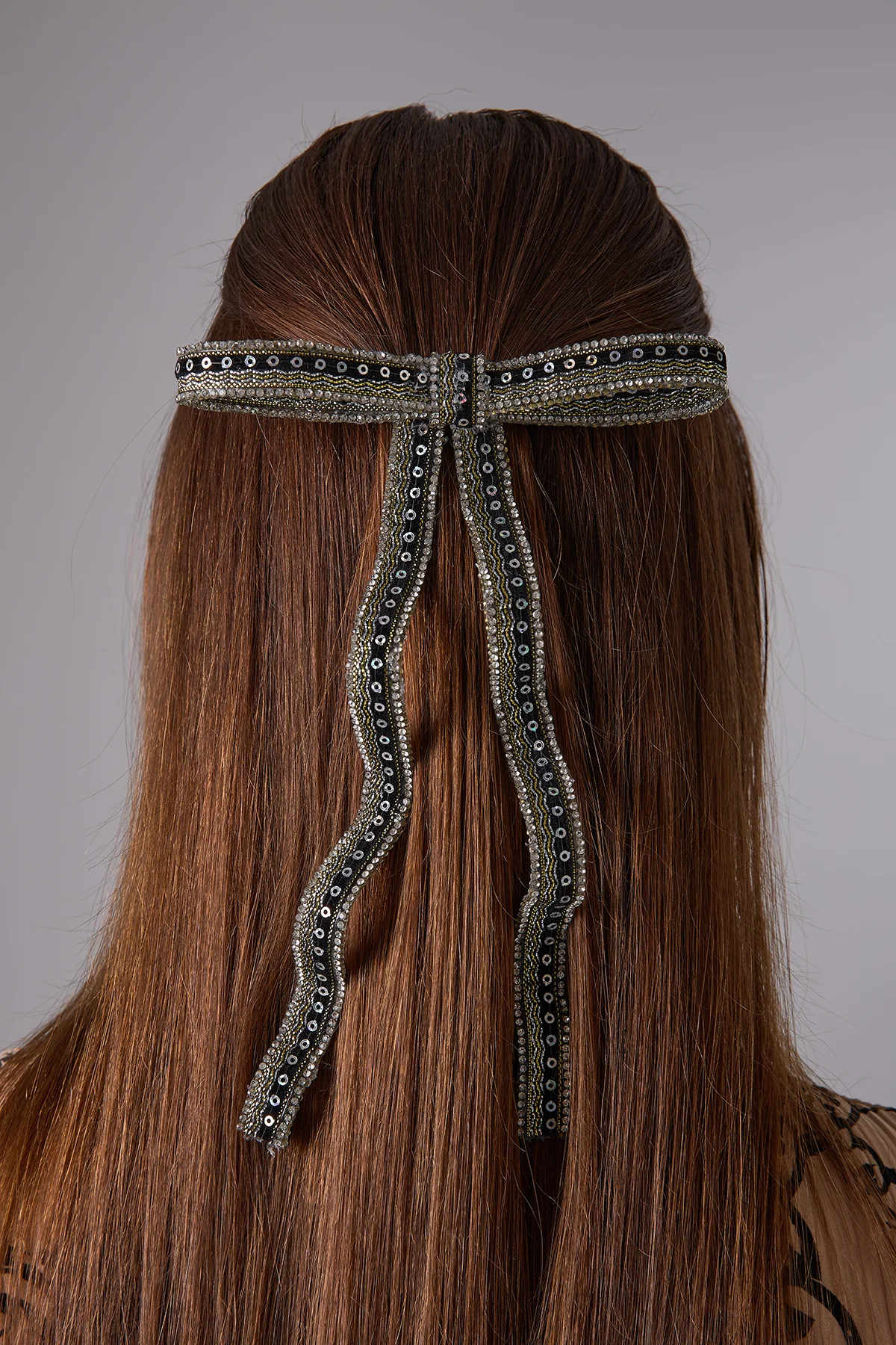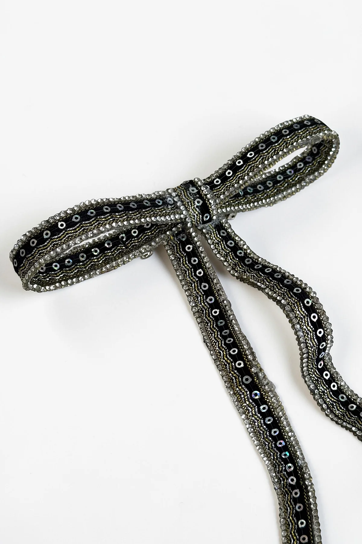 Malzeme: Atölyemizde kadife kurdele, kristal taş ve boncuk kullanılarak üretilmiştir.