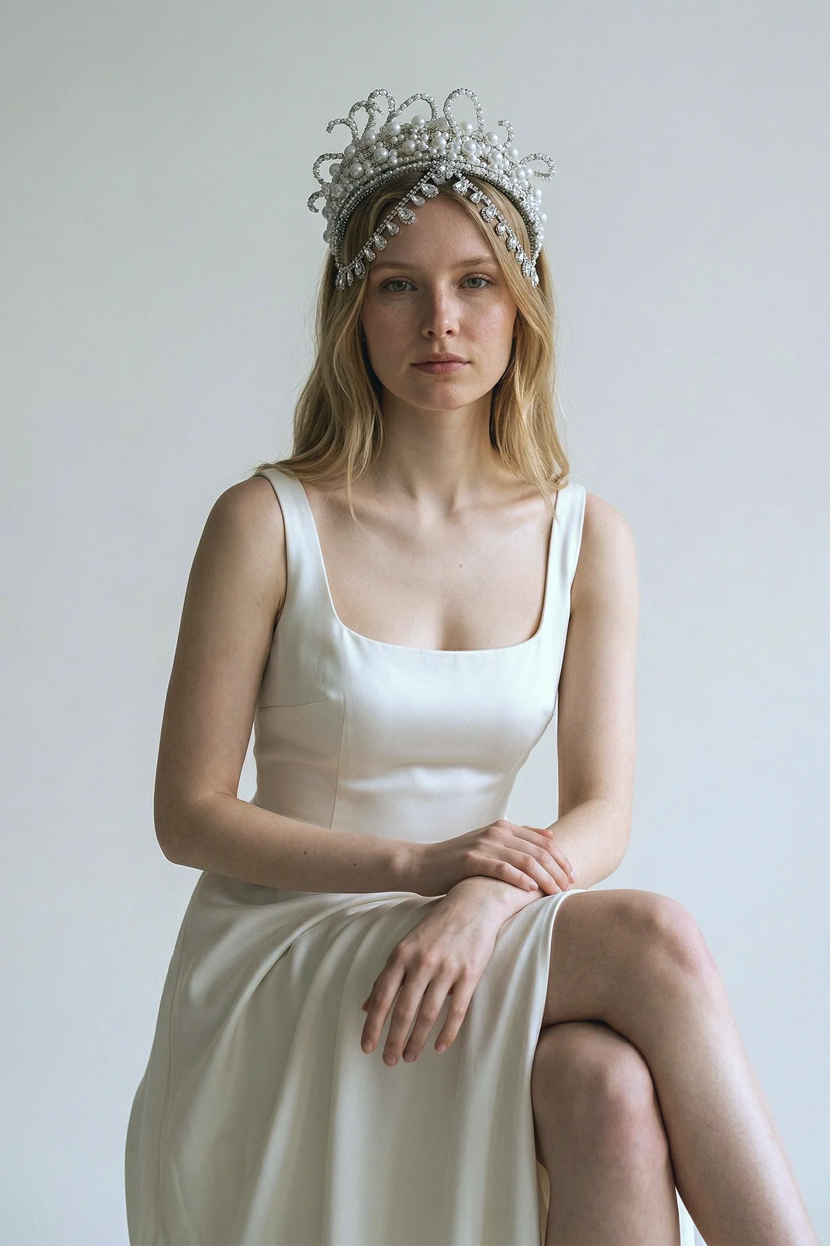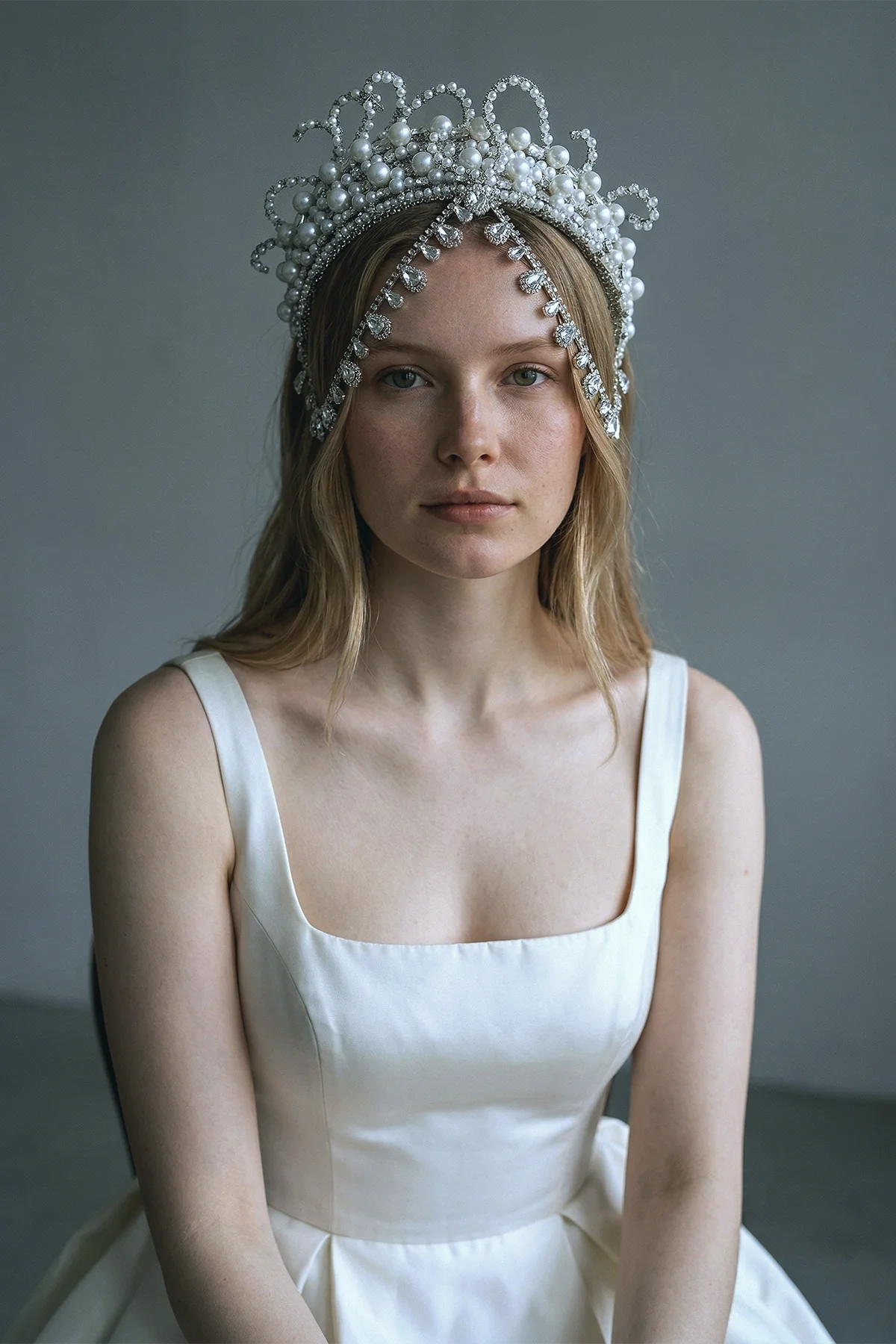 Göz alıcı ışıltısı ve iddialı tasarımıyla öne çıkan Lunaperla taç, inci ve ışıltılı detayların yoğun bir şekilde kullanıldığı gösterişli bir incili gelin tacı modelidir. Zengin ve hacimli yapısıyla dikkat çeken bu özel tasarım, tepe kısmındaki asimetrik dokunuşlar sayesinde klasik modellerden ayrılarak gelin stiline modern bir karakter kazandırır. Işığı güçlü bir şekilde yansıtan yapısı, saç modeline derinlik ve ihtişam katarak her açıdan etkileyici bir görünüm sunar.Lunaperla taç, özellikle ihtişamlı ve dikkat çekici bir stil arayan gelinler için tasarlanmış olup, düğün, nişan ve özel organizasyonlarda zarafeti ön plana çıkarır.