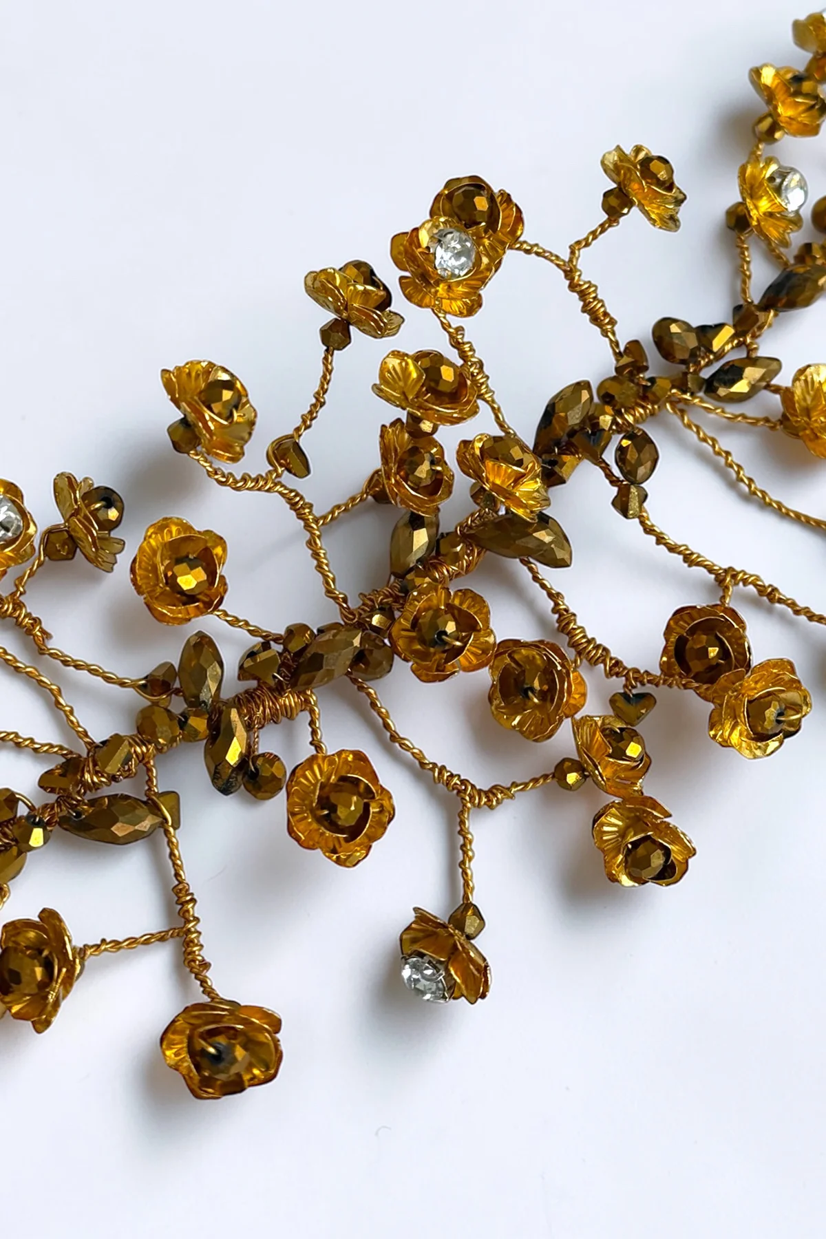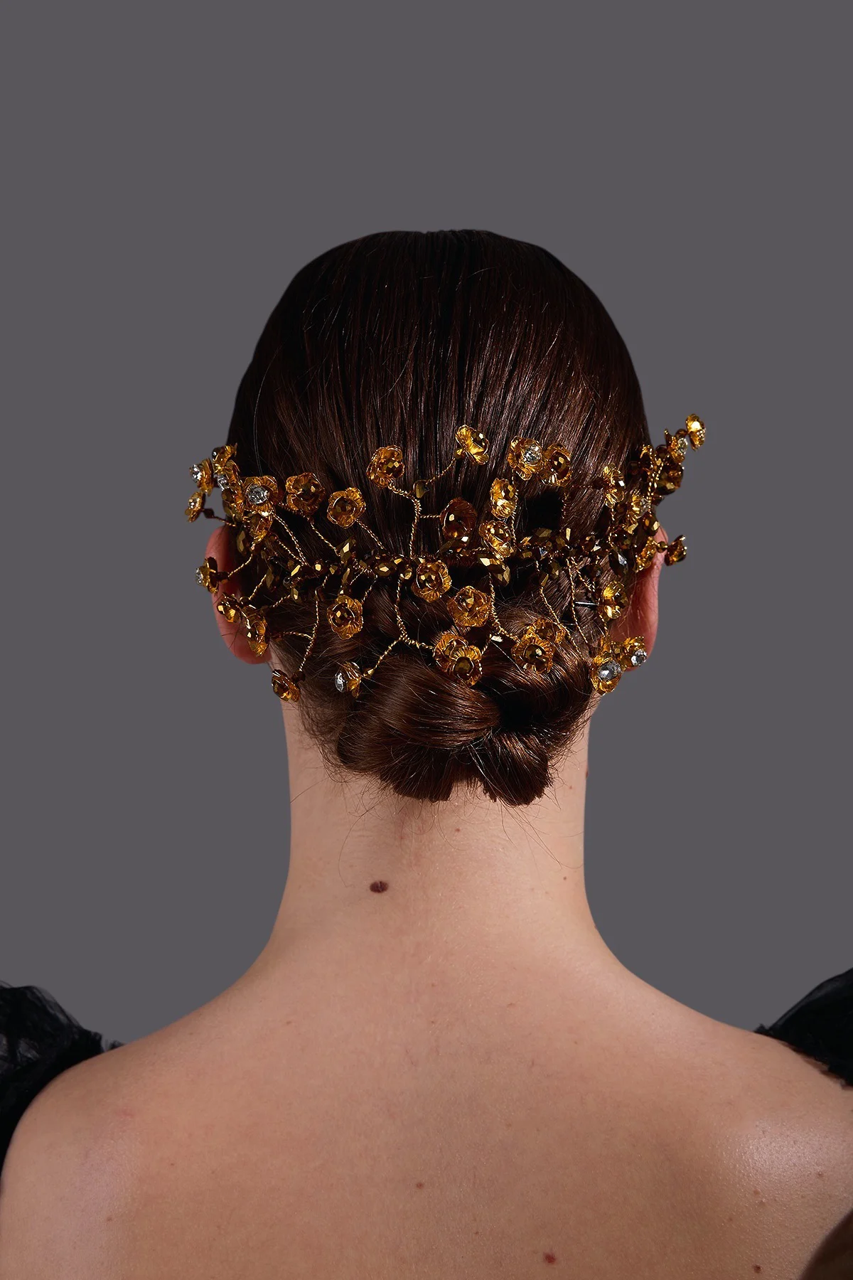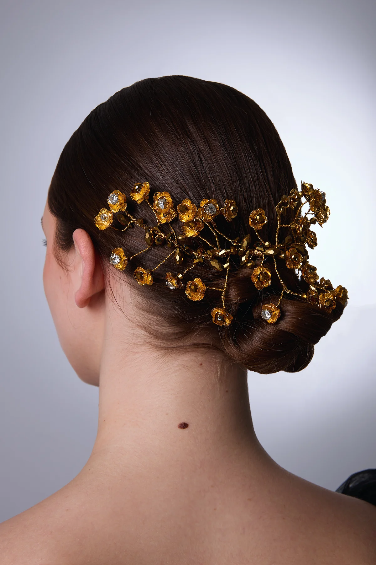 Zarif ve romantik tasarımıyla öne çıkan Petale saç aksesuarı, gold tonlardaki minik çiçek detaylarıyla süslenmiş şık bir gelin saç aksesuarı modelidir. Işıltılı dokunuşları ve ince işçiliği sayesinde gelin saç modeline zarif bir hareket katan bu özel tasarım, hem düğün hem de nişan kombinlerinde romantik ve sofistike bir görünüm sunar.