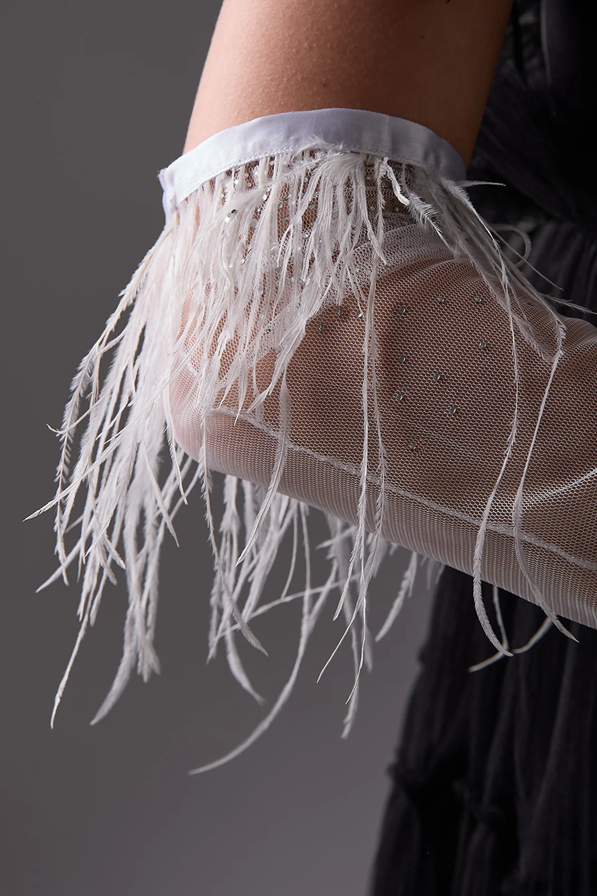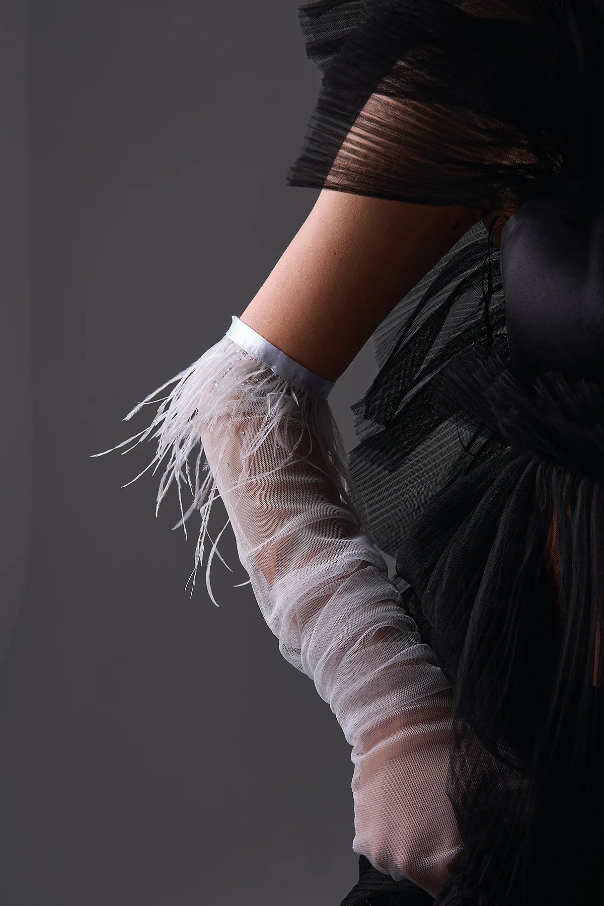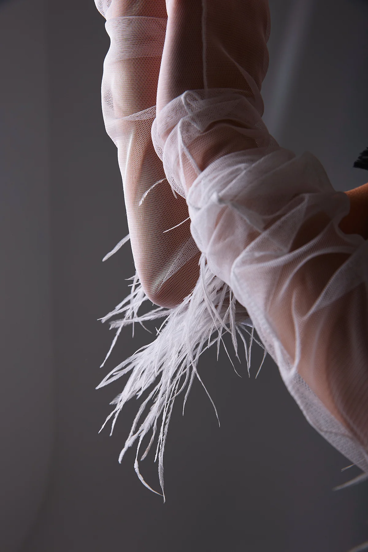 Viona eldiven, uzun ve parmaksız formuyla modern gelin stilini tamamlayan şık bir gelin eldiveni modelidir. Tüy ve ışıltılı detaylarıyla hareket kazanan bu özel tasarım, düğün, nişan ve after party kombinlerinde etkileyici bir görünüm sunar. Özgün ve sofistike duruşuyla Viona eldiven, klasik gelin aksesuarlarının ötesine geçmek isteyenler için ideal bir tamamlayıcıdır.